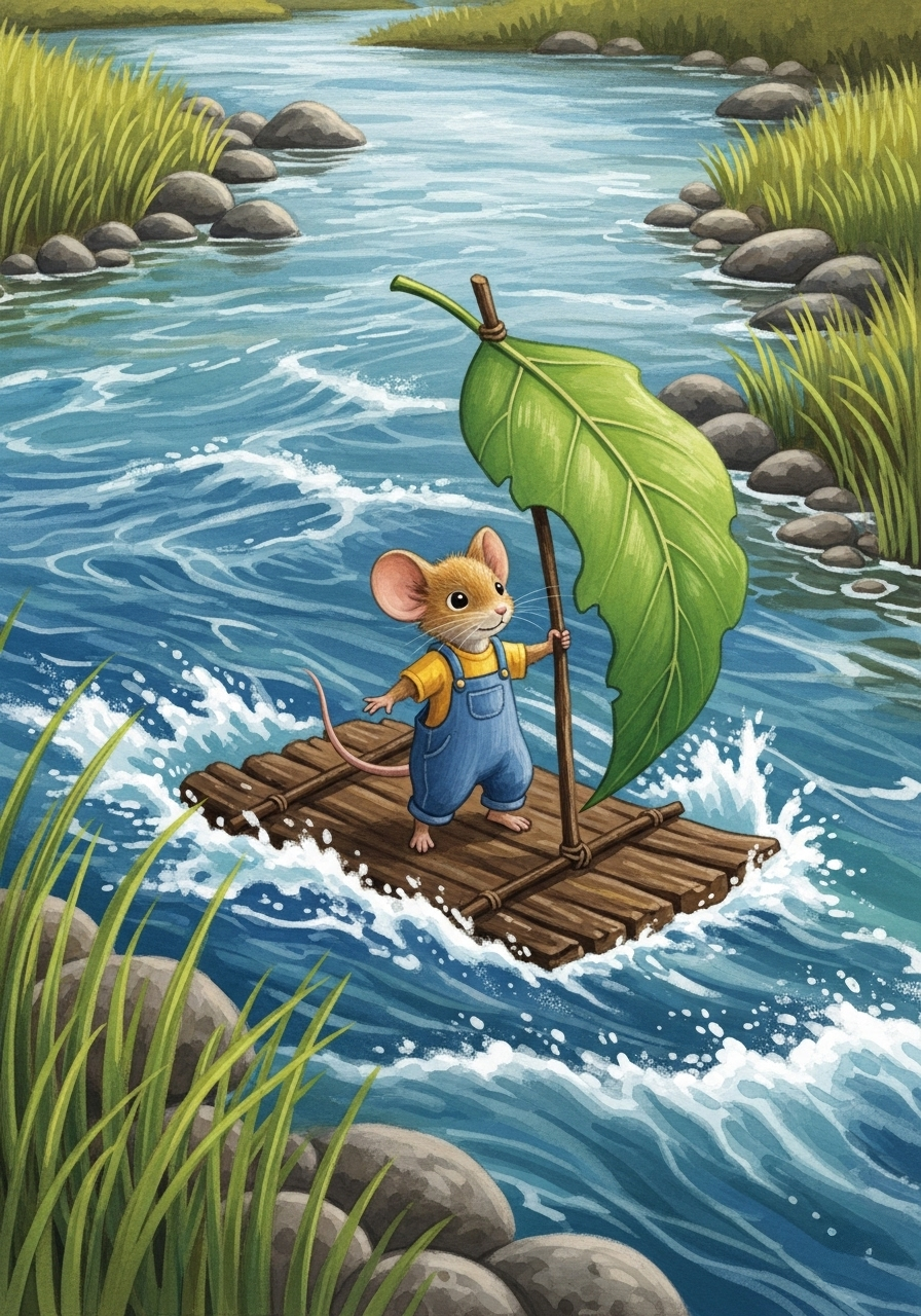 In a cozy burrow under the roots of a giant oak tree, lived a little mouse named Pip. Pip was afraid of many things: loud noises, dark shadows, and especially the wide, rushing river that flowed through the forest.